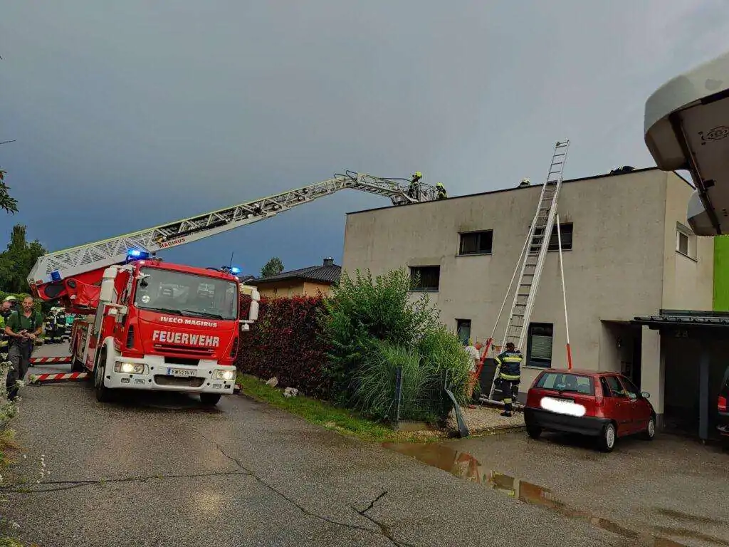 Am 18.07.2023 um 19:24 Uhr wurde die FF Treffen alarmiert – Brand eines Dachstuhls durch Blitzeinschlag am Sonnenhügel, Köttwein – Treffen am Ossiacher See.