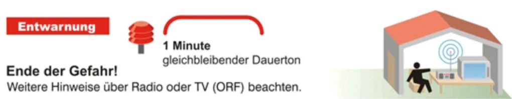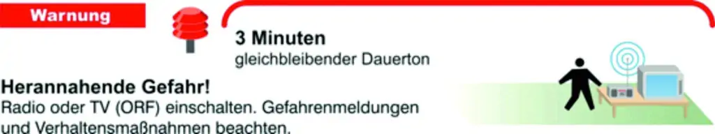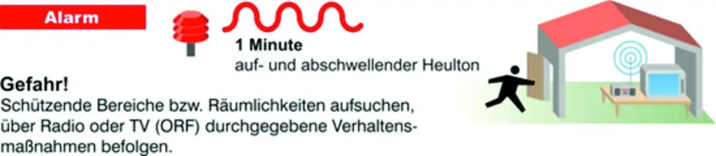 Ein auf- und abschwellender Heulton von mindestens 1 Minute Dauer bedeutet „Alarm“. Die Gefahr steht unmittelbar bevor. Radio TV (ORF) einschalten und Verhaltensmaßnahmen beachten.
